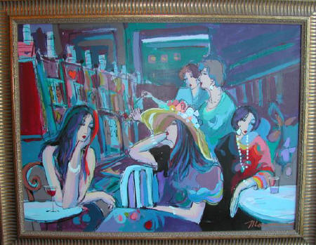 B. 1951 - Artist Isaace Maimon: Women meeting in somewhat hazy coffee houses. Colors that are bold and bright. The essence of a true urban scene, daytime life and night life intermingle. It is a warm, gentle and inviting atmosphere. The air is full of promises and secrets just like any self-respecting bistro. This is Isaac Maimon's world, the scene that he paints with consuming passion. Maimon's paintings capture the "boulevard culture," that uniquely French atmosphere that so intrigued Lautrec, Bonnard and other artists before him. Though strongly influenced by the Paris school of art, with Isaac Maimon's intrepid use of color and line he creates works that are absorbing, rich and uniquely Maimon. Maimon was published by B and R International. His works are in many private and public collections. He is truly one of the leaders of the Cafe movement. Art Brokerage is a major secondary dealer in Isaac Maimon sculptures, prints, lithographs, sculptures and original oils on canvas as well as watercolors.