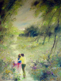 Romantic Spring Day Early period late 1960, museum framed and mounted Original Oil on Canvas 24 by 36 inches POR