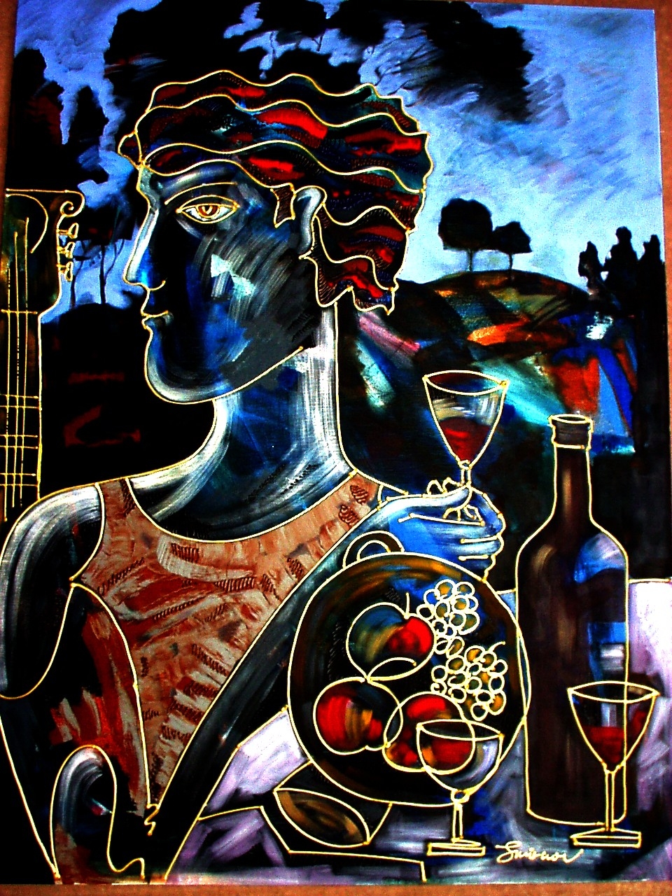 Igor Smirnov, a son of famous Russian landscape artist Vasili Smirnov, began to paint in his childhood. Eventually, he developed his own unique style of “symbolic realism.” It bears no resemblance to either socialistic realism or any of the numerous avant-garde ‘isms’ of the twentieth century. Smirnov’s works are recognizable by their distinctive framework and color structure that create the impression of stained glass or enamel along with a feeling of mystery. A precise linear framework that prevents the transformation of the painting’s surface into chaos of colors contributes to this effect. The assurance and boldness of lines recalls the works of Picasso done between 1910 and 1920. But the resemblance to the famous cubist artist ends there. Smirnov is not interested in the analytical division of objects into their components. His method is really the opposite. It is the melding of forms rather that their destruction, harmony, not dissonance. People, beasts, birds, fish, fruits, flowers, art objects, everything is united by the beauty of Igor Smirnov’s harmonious fantasy world that stands before us like the embodiment of music in line and color. (“Bursting into Music” by Reena Judens, MARINA MAGAZINE, March 1995).